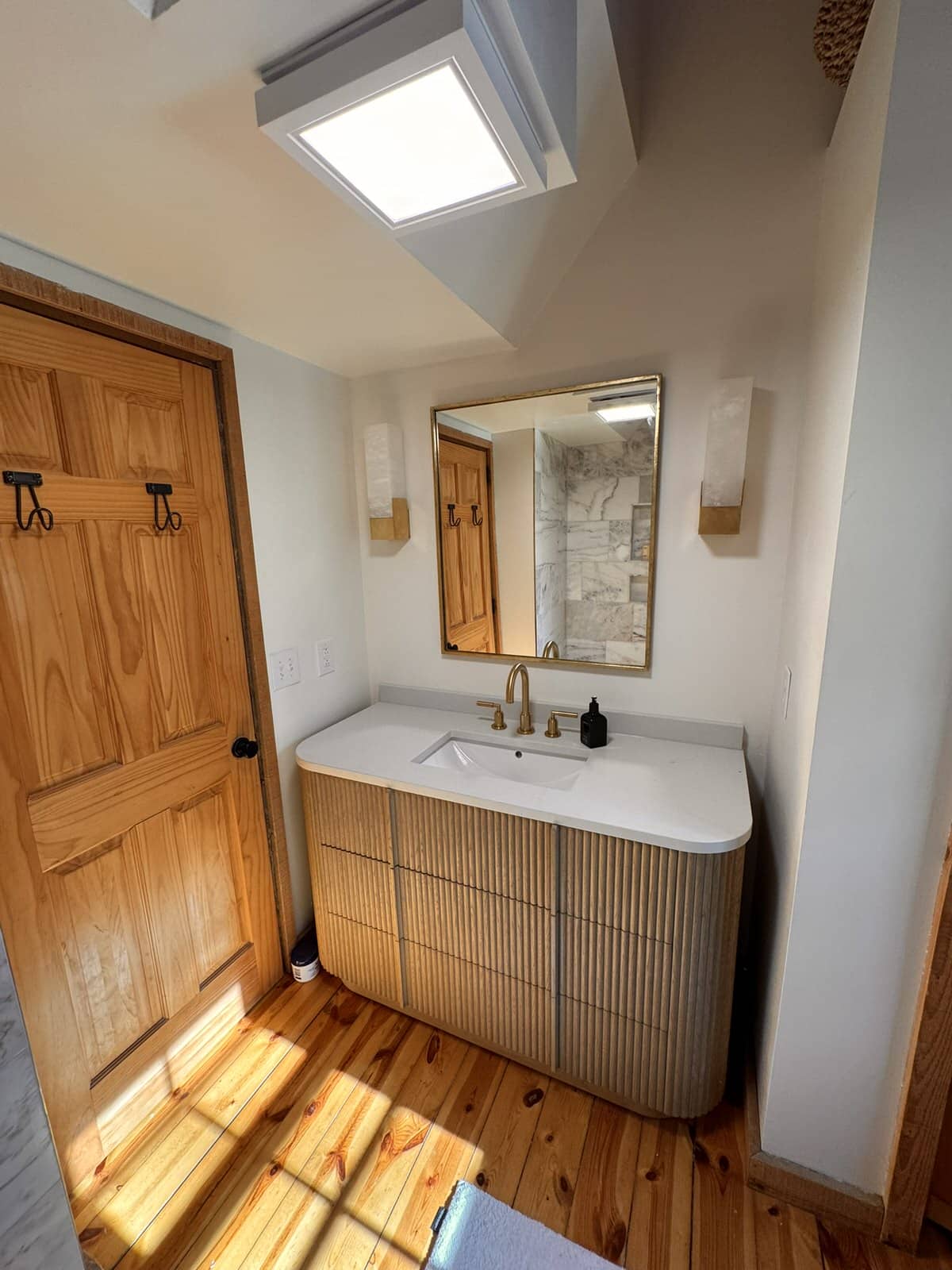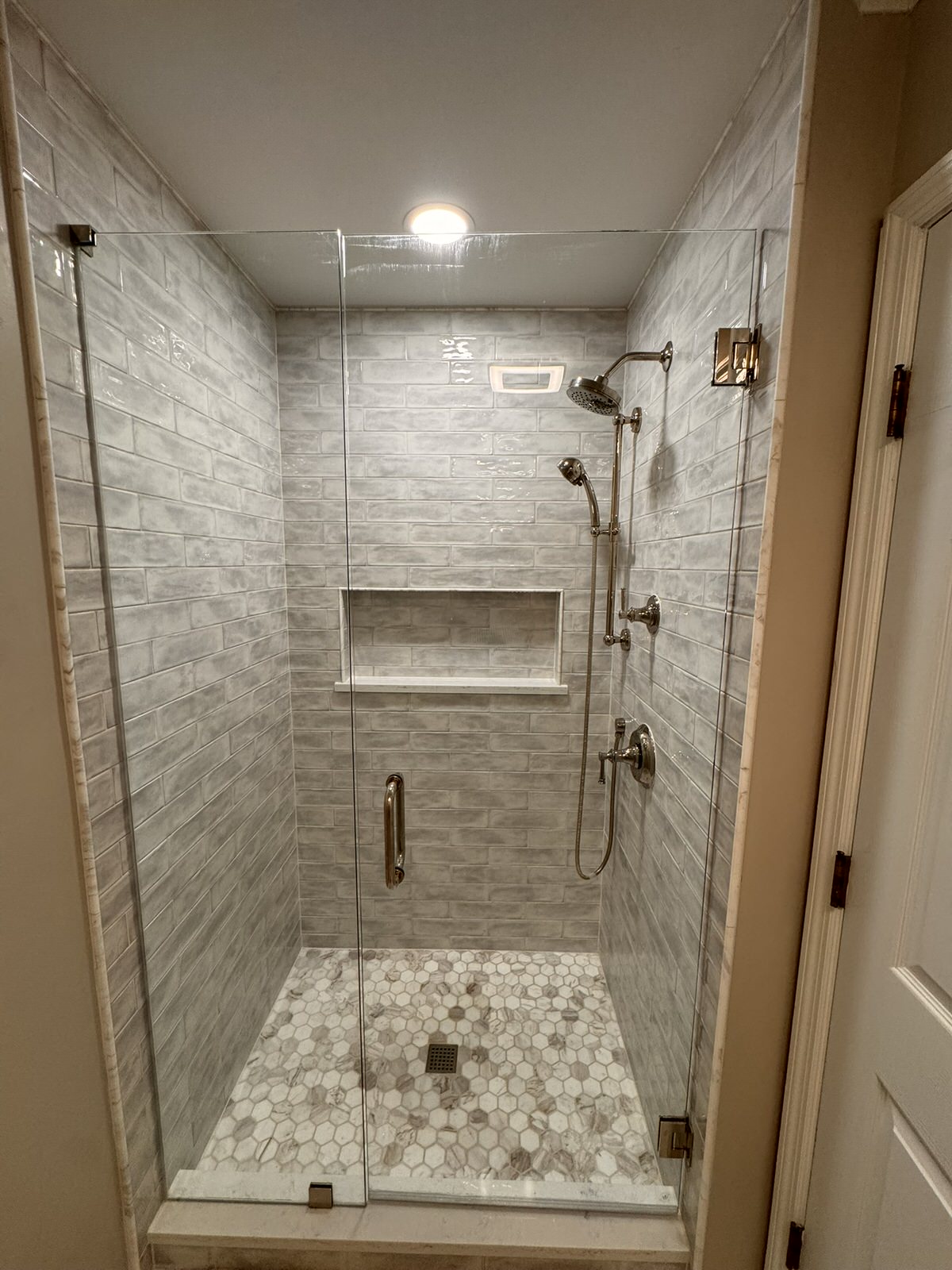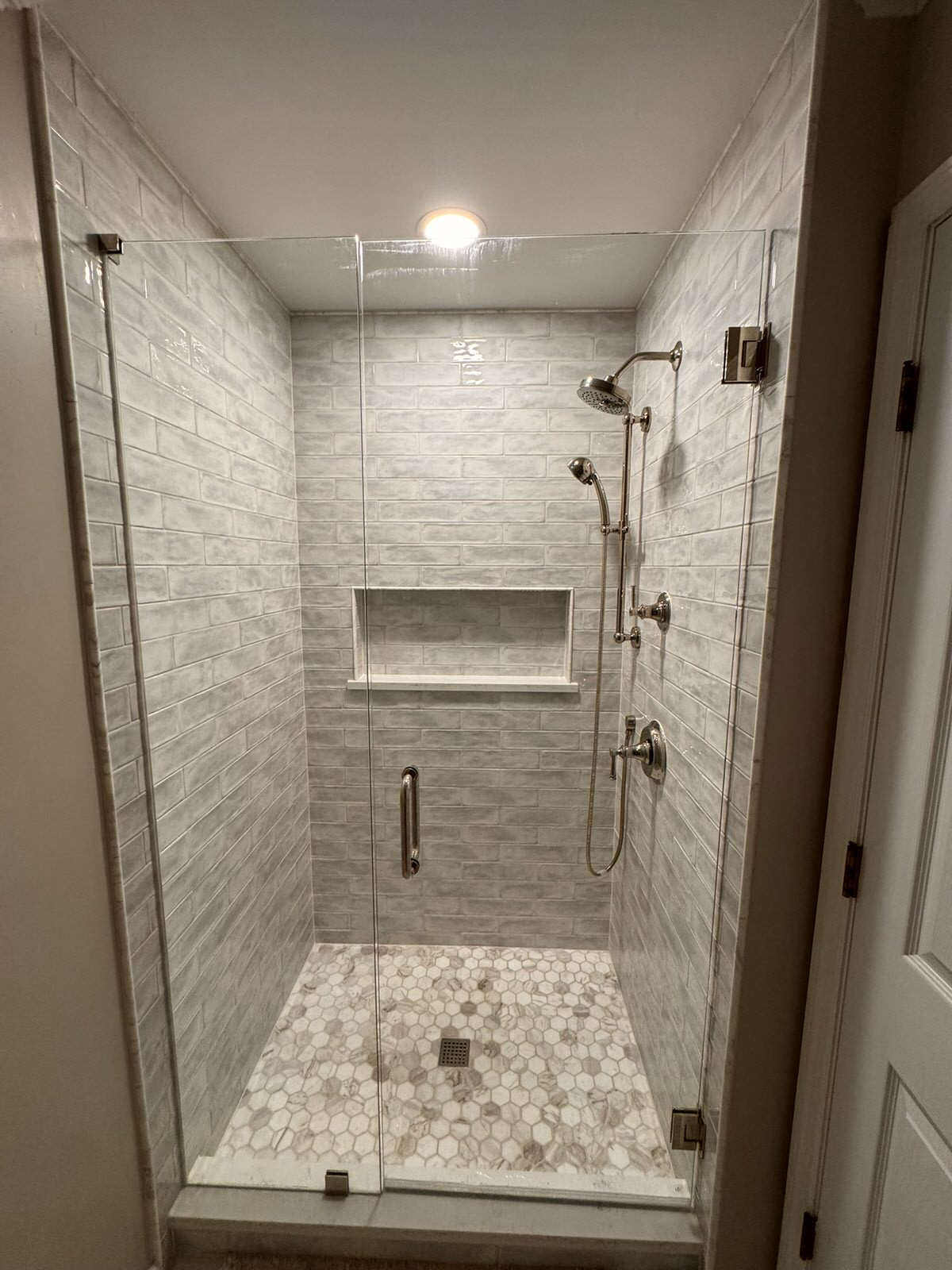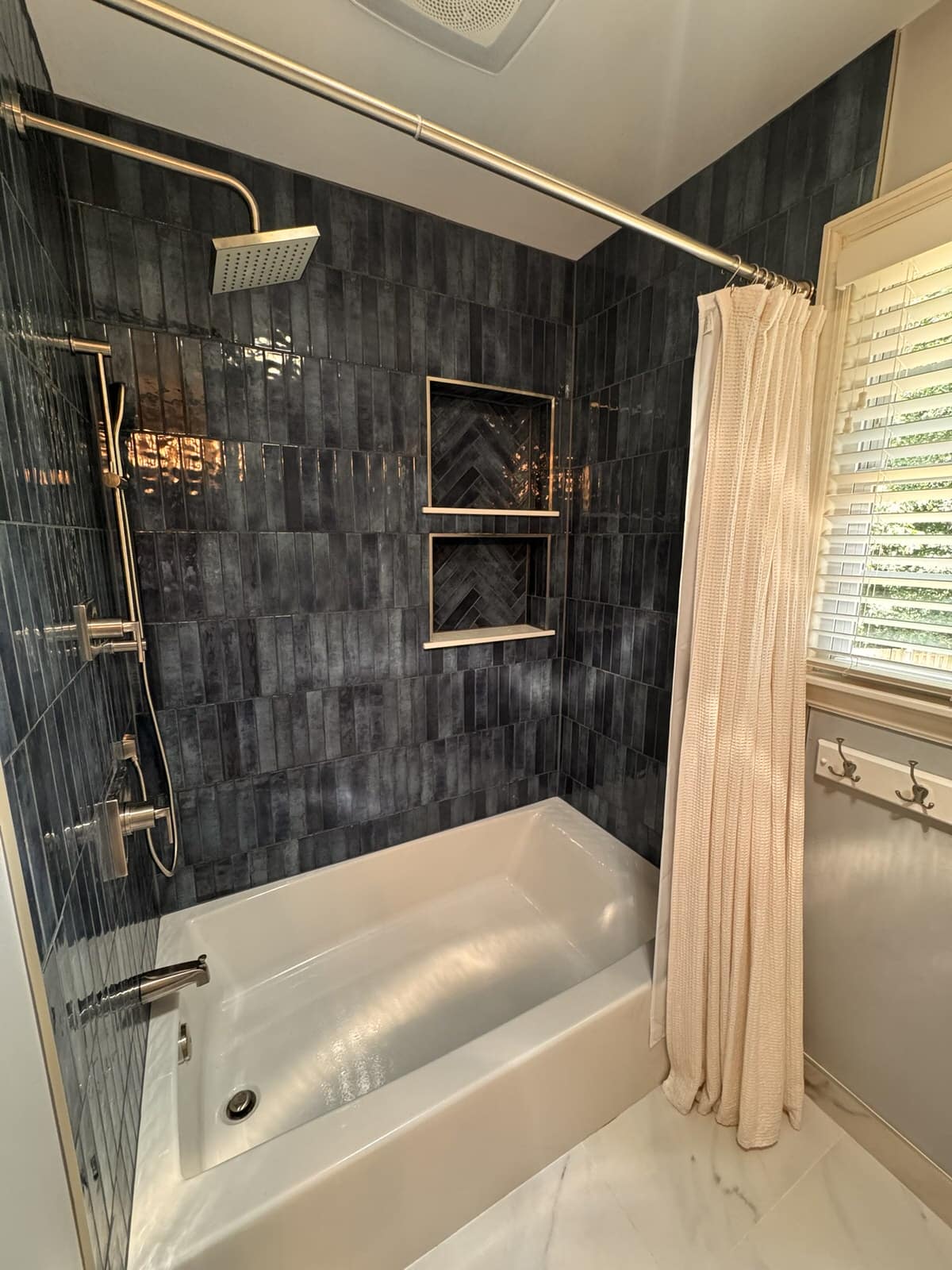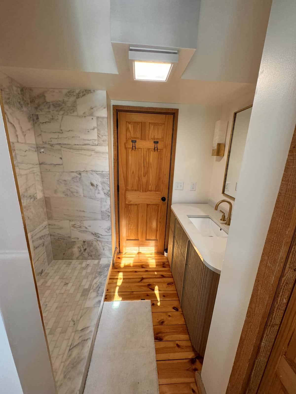 They transformed a 60-year-old moldy cave of a bathroom with a rotten floor to a luxurious and modern oasis. The entire team has great ideas and are very creative. The design choices included a floating vanity, pocket door, and removing a useless wall to make a tiny bathroom seem a lot larger.